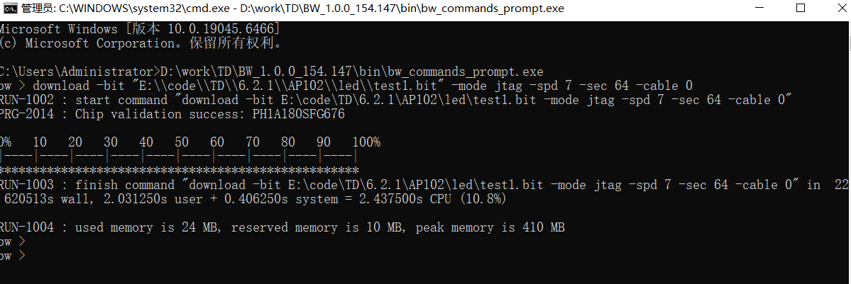 步骤3: 输入download -bit “E:\code\TD\6.2.1\AP102\led\test1.bit” -mode jtag -spd 7 -sec 64 -cable 0 → 回车